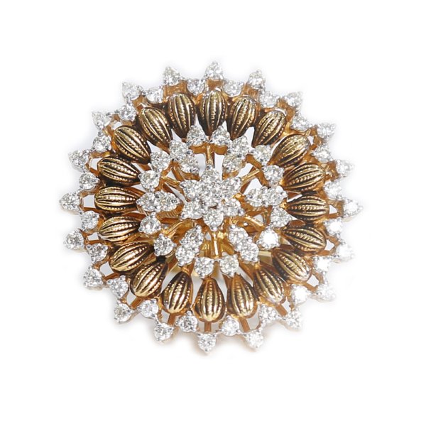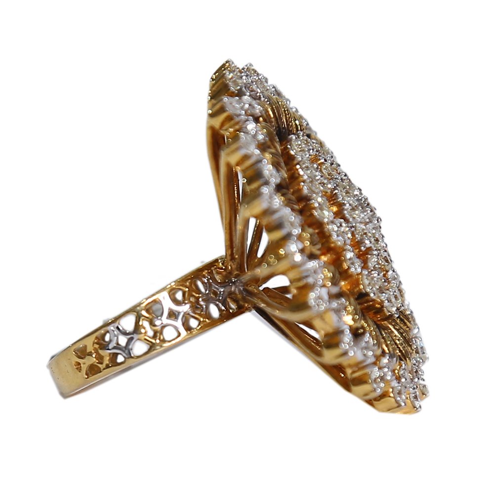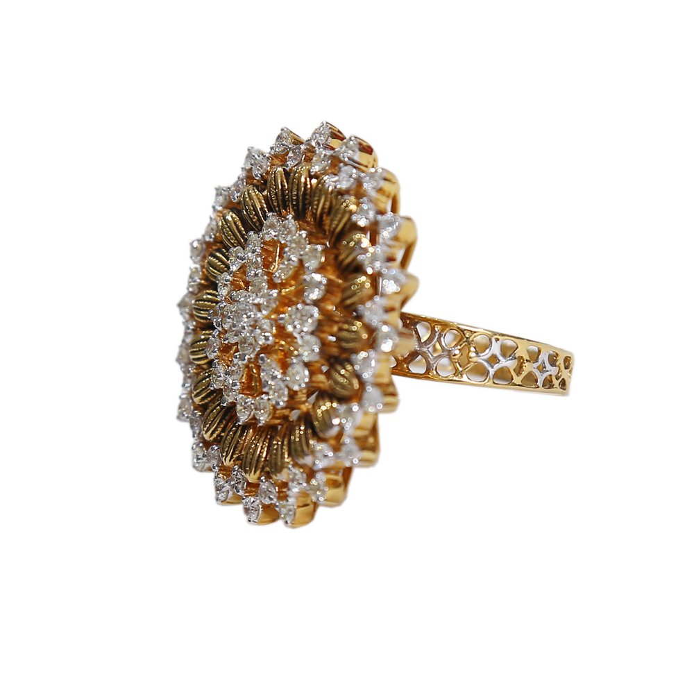 The brilliantly-cut diamonds arranged in a circle lend the uniqueness to the design. The priceless stones add to the luxurious charm. The ring has been meticulously rendered by our adept craftsmen with a skillful lineage. The handpicked diamonds and the lustrous gold have been handcrafted into a state-of-the-art piece. It is a classic motif to showcase your romance for your loved ones and make them feel like royalty.
